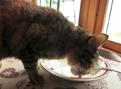 Lucy, som saknar all form av fostran, hoppade upp på frukostbordet direkt vi började äta och mutades genast med ost av min Agnes. Detta fick mig att hoppa upp i soffan, så jag bättre skulle kunna ta min tilldelning.
